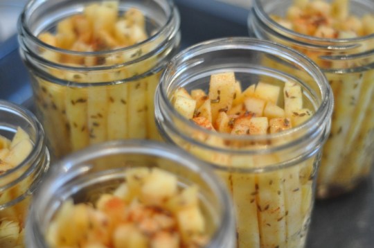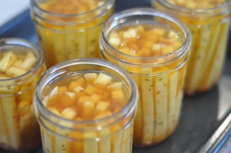 With little flecks of cumin seeds floating about, these golden-yellow rutabaga strips look like they are glowing in the slightly orangey vinegar.  If they taste as good as they look we will consider it a success and possibly make a second batch before the winter is over.