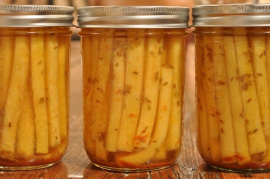 Fill a jar with rutabaga sticks, place an orange habanero and or hot cherry pepper (with just the stem/cap cut off) on top with a few fresh garlic cloves. Fill with a vinegar, water and salt brine (salted to your taste). Cook for 20 minutes. AMAZING and couldn’t be easier.