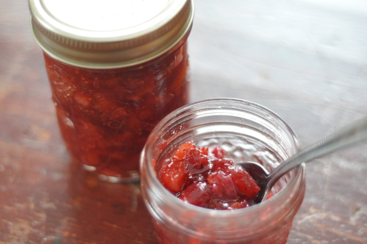 Chutney’s are savory preserves that can add flare to your favorite dinner meals of pork or chicken but they can also dress up a ham or turkey sandwich. They have a smooth jam like consistency with the additional complexity of a sour and/or savory element. This recipe comes from Mary Anne Dragan’s canning book Well Preserved and it’s a great one to try over the winter months when these ingredients are readily available at your grocery store. Some of you may even find cranberries, dried apricots and oranges kicking around the kitchen (as we did).