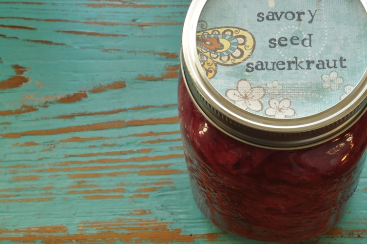 The savory seed sauerkraut was the last crock standing and it now resides happily in 6 ~ 1 litre jars.  At first, I wasn’t completely crazy about this kraut.  It isn’t as crunchy as the traditional plain salted cabbage/sauerkraut that we normally have brewing and it took a lot longer for it to start doing its thing.  The bubbling and bloom that developes indicates that it is fermenting and turning into a tasty, tangy concoction.  But, this batch sat covered in bloomless brine for about 3 1/2 weeks.  Then, the bloom began and the tangy taste started to develop and convert this green and purple cabbage into a piquant coloured kraut.