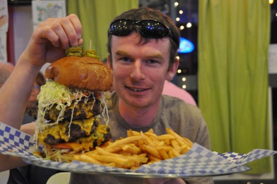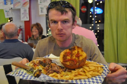 At first all was well.  The boys were starving and full of confidence but as Matt’s 3 pound burger arrived the hope of succeeding diminished slightly.  This burger was MASSIVE.  Gluttonous in fact.  Anyone who knows Matt knows he can eat but he is slow.  Slow, slow, slow!  A timed challenge just seemed wrong!?!