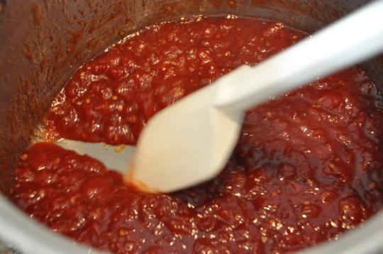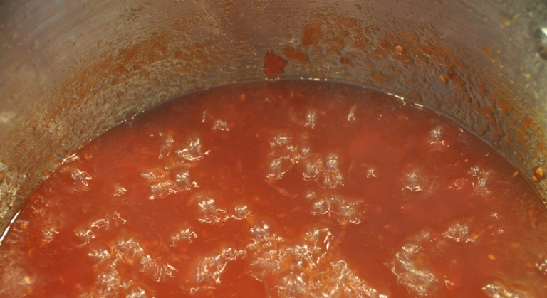 After about 40-60 minutes you will notice that the tomato jam has reduced by about half.  Be sure to stir it more frequently so that it does not stick or burn to the bottom.  Notice in the photo how much it has reduced.  Notice the starting level on the side of the pot.