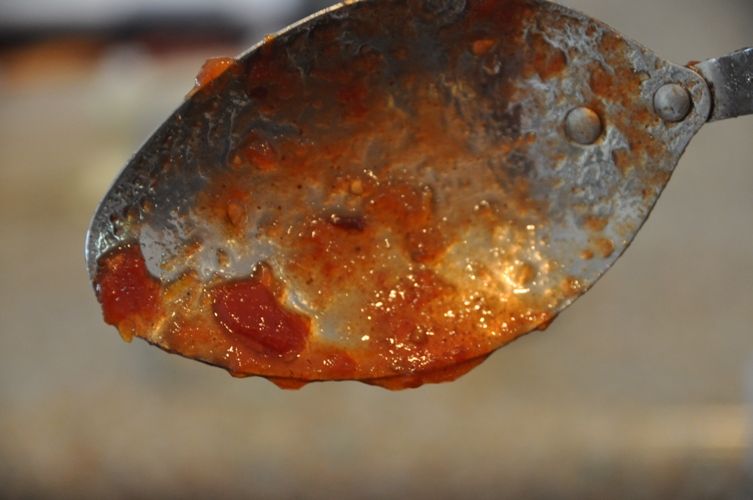 At this point you should remove it from the heat and do your frozen spoon test.  Collect a small representative of the jam on your spoon and hold it horizontally.  If the jam collects into a large mass and does not run easily you know it is ready.  If it continues to run quickly and forms syrupy drops return it to the heat and test again in a few minutes.  The photo below demonstrates a successful spoon test, this jam is ready to jar.