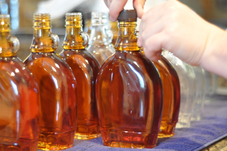 After you’ve built your fire, you can sit back for a while and enjoy a pint or two with friends but be sure to keep your fire blazing and the sap boiling.  It takes hours and hours to reduce the sap to syrup.  Our fire was lit today at about 11am and the maple syrup was in bottles by about 6pm.  You know it is ready when it reaches 7.1 degrees F above the boiling point of water (here water boils at 212 degrees F). You can hold it at 219 degrees F  for a short while to thicken it up but don’t let the temperature climb because that will create sugar crystals on the bottom and sides of  the bottle.