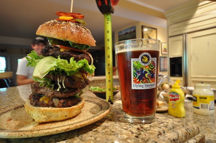 2. There is no time limit.  However, the first person to finish a two-pound burger (including home-made bun and toppings added) plus 3 pints of Flying Monkeys Hoptical Illusion draft beer wins the title and spoils of the competition.  The spoils…more beer!