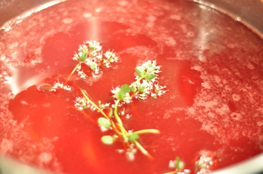 - Pour currant juice (approximately 3 cups), sugar, thyme honey, poached lemon slices with sugar-water, lemon juice, and sprigs of thyme in flower in a large stainless steel preserving pan.