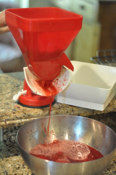 Note: We used our tomato mill to separate the seeds and extract the juice and pulp. But, we also had to filter it a second time to separate the juice from the pulp. Reserve the pulp to make fruit roll ups and the seeds can be used to flavour vinegar.