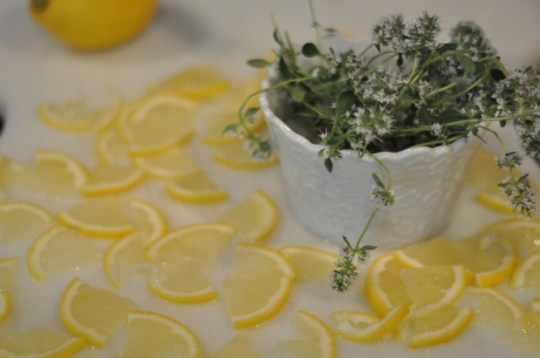 - Add lemon slices and thyme sprigs to each hot sterilized jar. Skim the jelly carefully. Ladle the jelly into each jar, leaving a 1/4″ headspace. Remove air bubbles, wipe rims, place lids and screw bands on adjusting so that they are just finger-tip tight. Process in a hot water bath for 10 minutes.