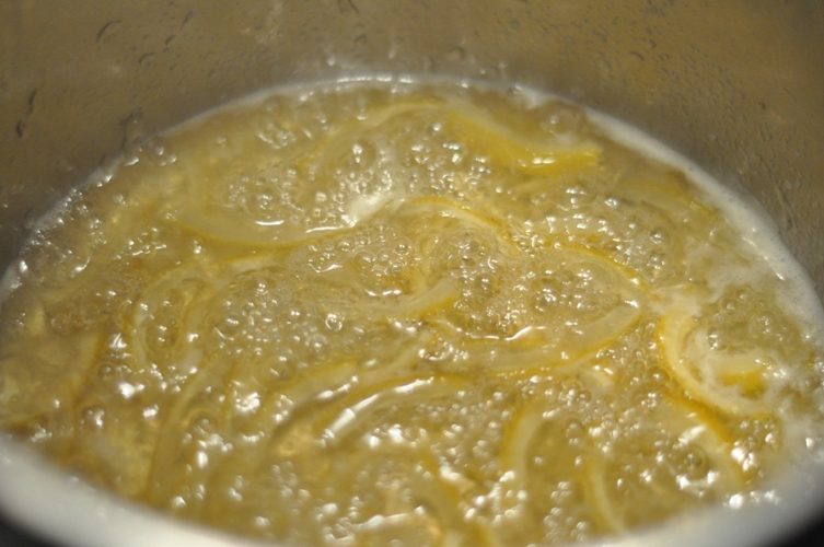 - Rinse lemons well and cut into thin rounds and then quarter. Place lemon slices in a stainless steel preserving pan with 3/4 cup water and 1/2 cup sugar. Bring to a boil. Continue to boil lemons until the slices become translucent (approximately 15 minutes). Add more water if necessary so they do not stick to the bottom.
