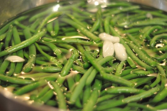 5. Working in batches place beans in rapidly boiling water for 3 minutes and cover.  Remove using tongs and immediately place into ice water for about 5 minutes.