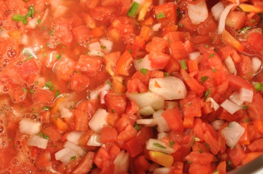- In a large stainless steel saucepan combine tomatoes, onion, garlic, peppers, vinegar, coriander, orange and lime juice, sugar, and salt. Bring to a boil over high heat, reduce heat and boil gently, uncovered for 30 minutes or until mixture is thickened, stirring occasionally.