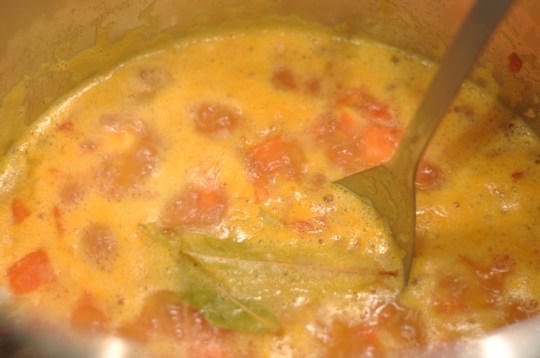 4.  Add sugar and salt.  Return to a boil and boil gently for 10 minutes.  Remove from heat and discard bay leaf.