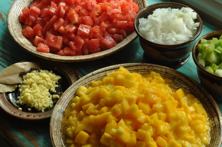 1. Blanch tomatoes in boiling water for about 60 seconds or until skins start to crack.  Place tomatoes in ice water to quickly cool.  Remove skins, seeds, and dice.  Note: scoring the bottom of each tomato prior to blanching will help to remove the skins more easily.  Prepare remaining ingredients.  Remove seeds from hot peppers and finely chop.  It’s a good idea to wear gloves and use a separate cutting board.