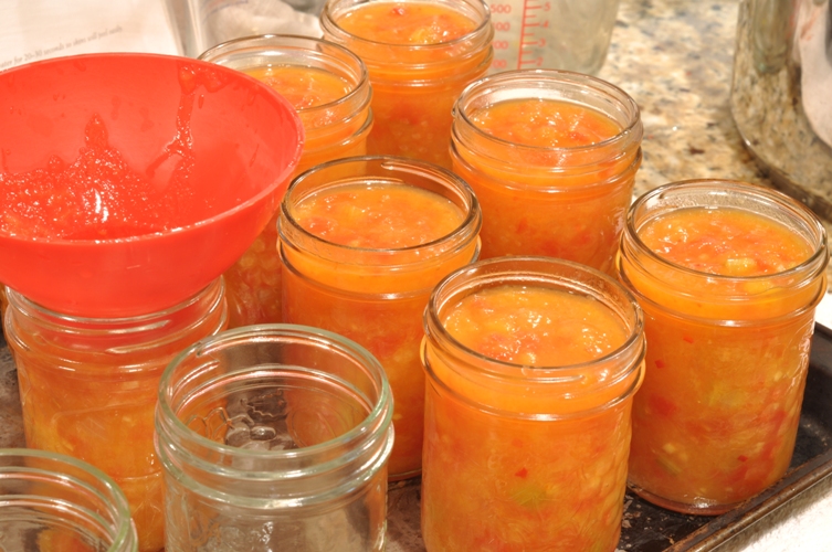 Tomatoes, tomatoes, tomatoes.  Are you guys sick of reading all the things we canned with them?  The end is in sight.  We can almost see the finish line.  For lots of you tomato season is nearing to an end if it hasn’t already.  But, for the few who still have tomatoes growing in the garden and want to try something different this next recipe is sure to hit the spot.  In fact, it’s new for us as well.  With a few mangos left over from the Parrots Head Spicy Salsa and a lot of tomatoes we thought this little gem would be a nice addition.