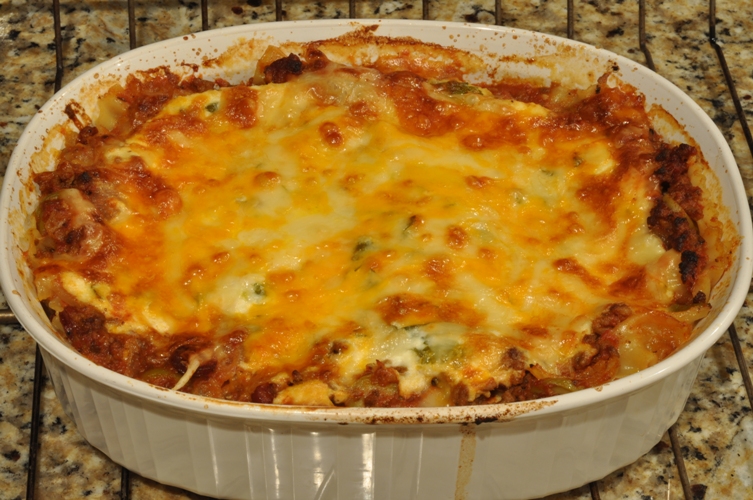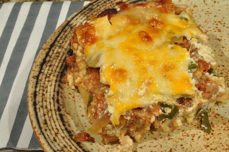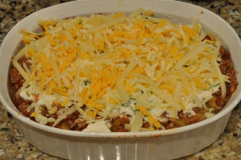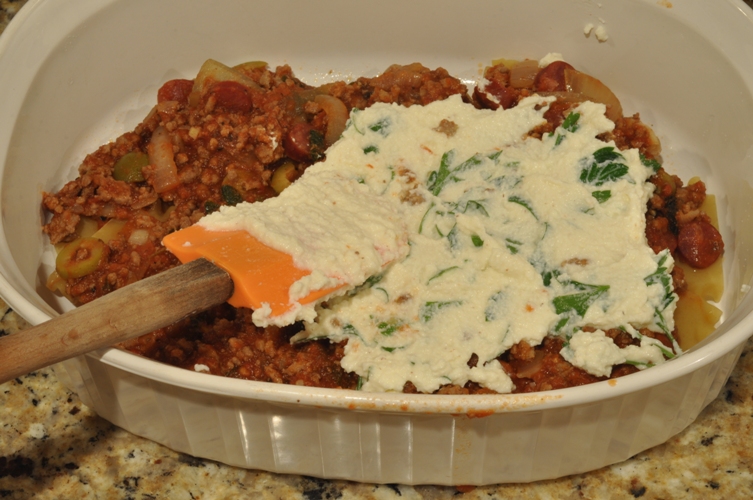 8. On the bottom of a baking dish (approximately 9″x12″) place a layer of lasagna noodles.  Smooth in thin layers over the noodles, the meat sauce mixture, the ricotta mixture, and the grated cheese.  Repeat layers until ingredients are used up.