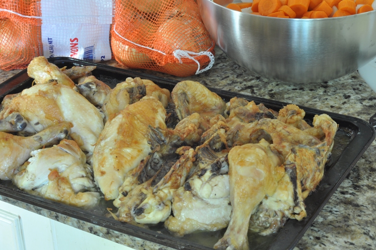 - Once cooked, remove chickens from oven and allow to cool slightly. Remove skin and all meat, chop into small bite size pieces. Set aside to add to soup later.