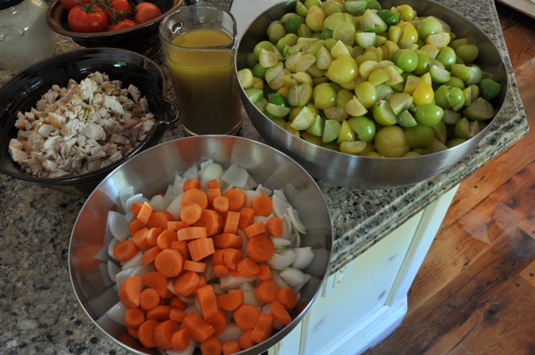 Clearly, we had a glut of tomatillos and this recipe was derived out of the need to put them to good use. You can do it on a much smaller scale using boneless skinless chicken breasts but we decided we were going to need more than just a few chicken breasts to make this soup hearty. So, two whole chickens was the most economical way to proceed.